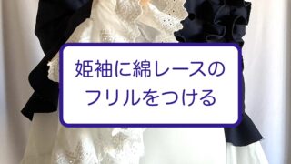 紺色のワンピースの姫袖部分を製作しております。今回は綿レースのフリルつけを完成させたところをご紹介しております。