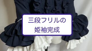 紺色のワンピースを製作しております。今回はフリルの姫袖が完成しましたので、ご紹介しております。