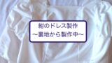 まず右側、左側に袖をつけて生地をつなげました。パフスリーブに姫袖スタイルのワンピースです。裏地の白い部分のフリルがチラッと見えるような袖にする予定です!姫袖ロマン・・!
